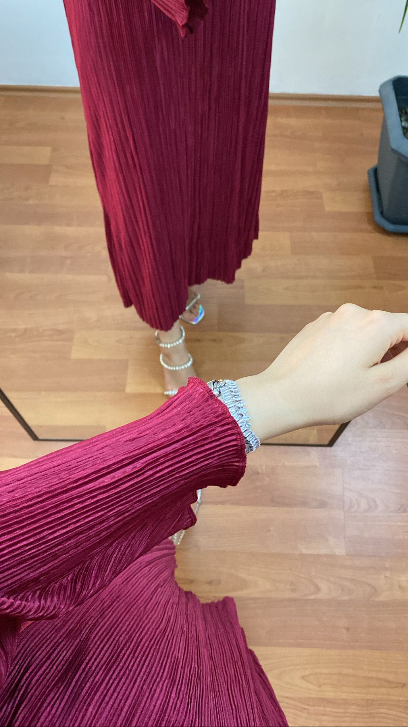 • Pliseli saten dokusuyla zarafeti ve akışı bir araya getiren bu özel gün elbisesi, her adımınızda şıklığı yansıtıyor.