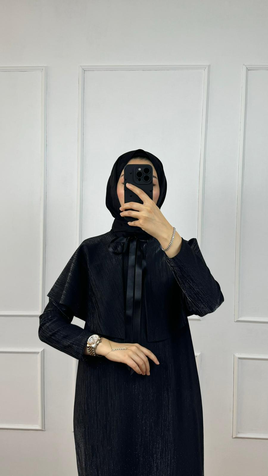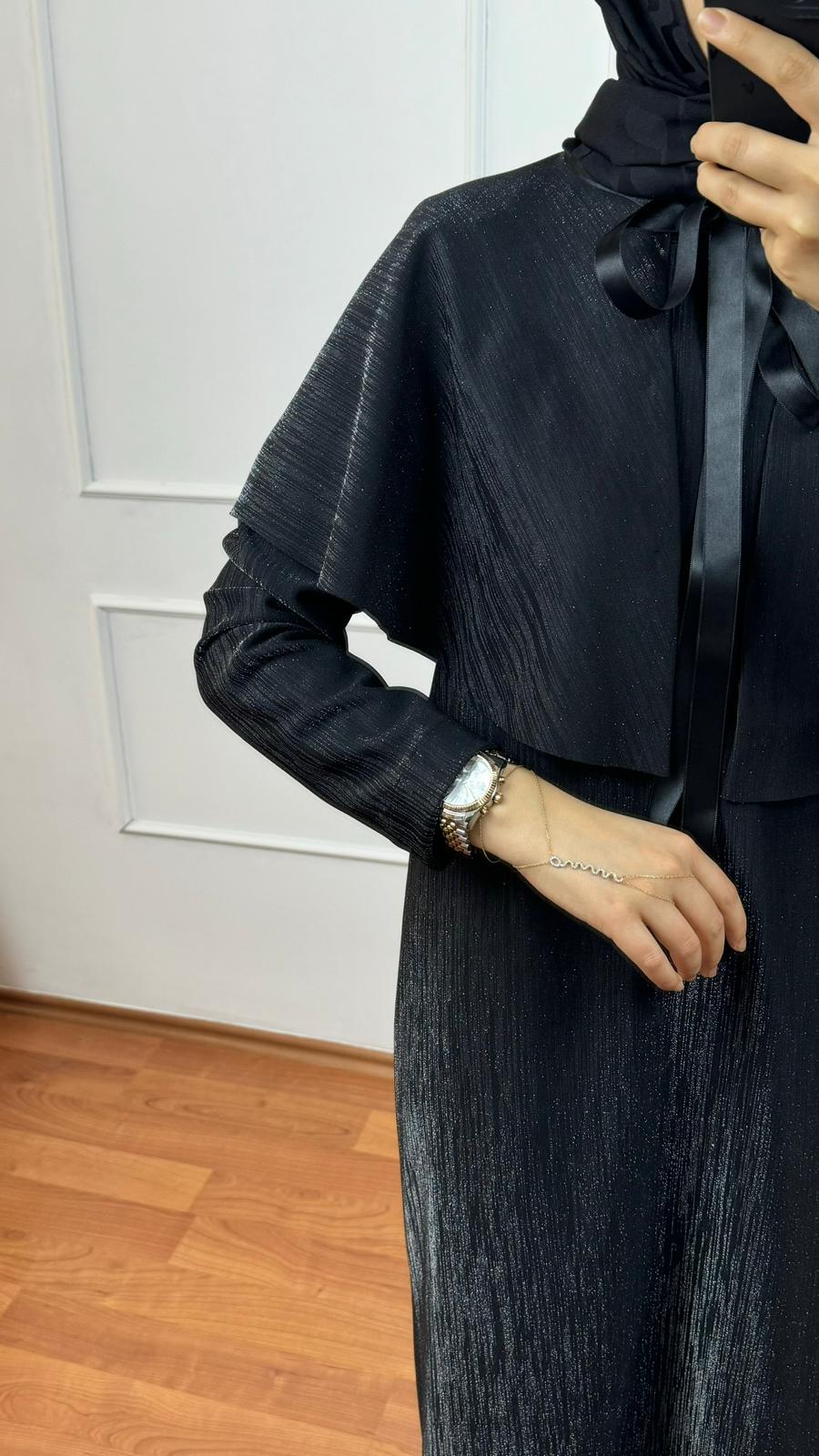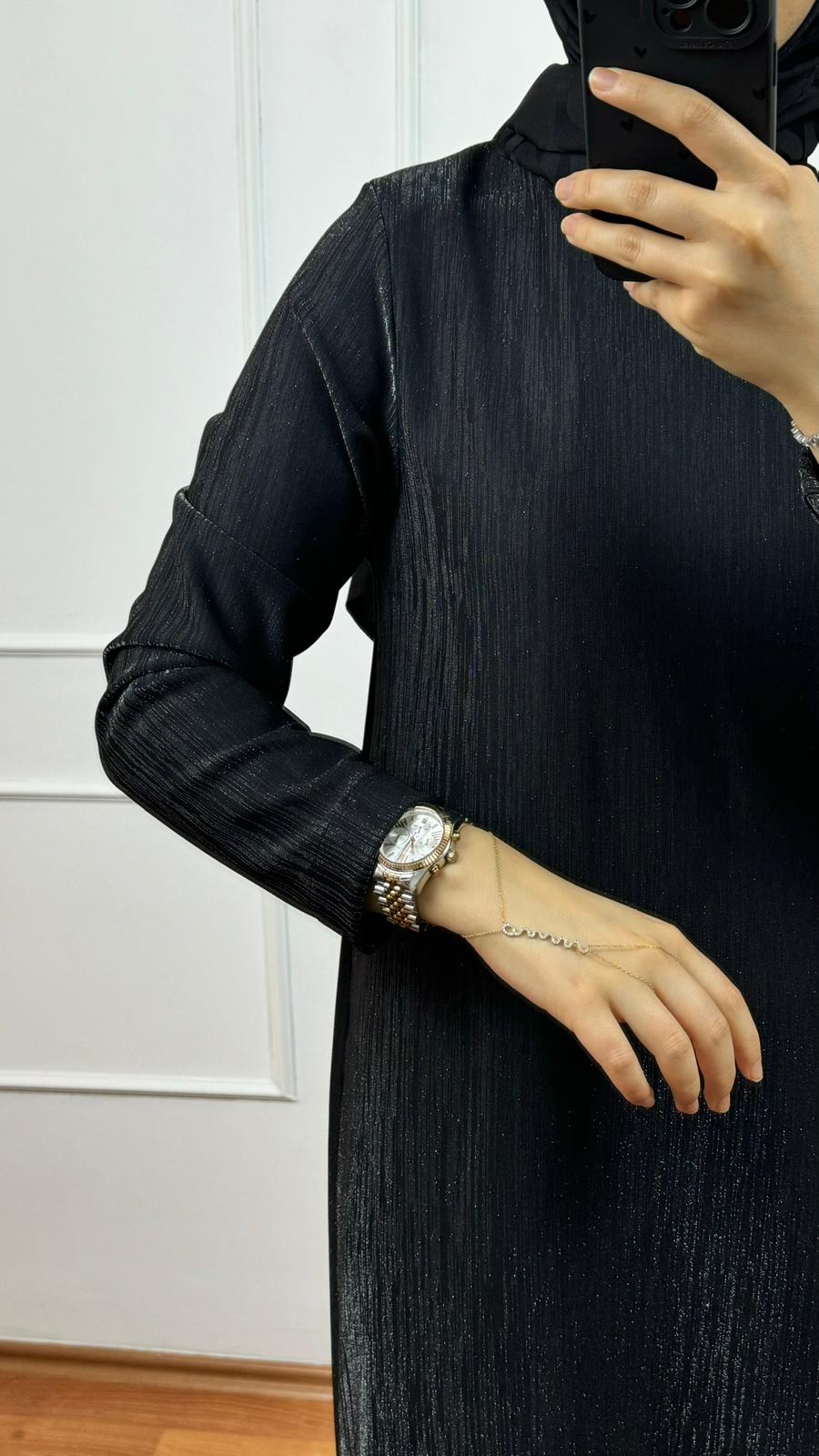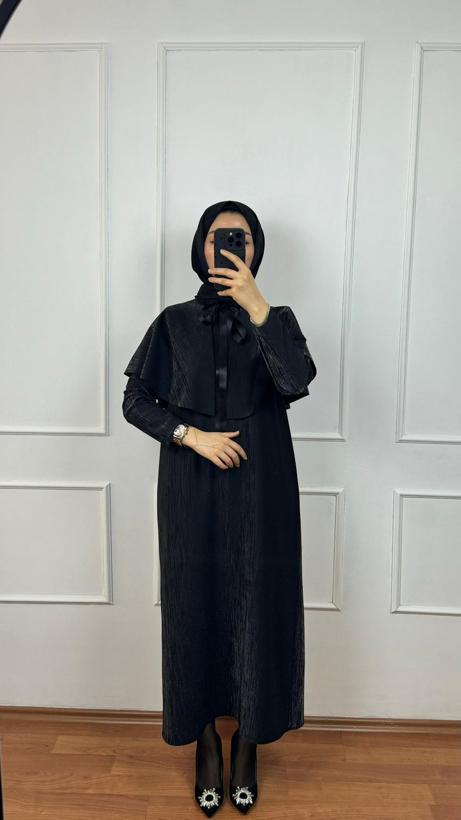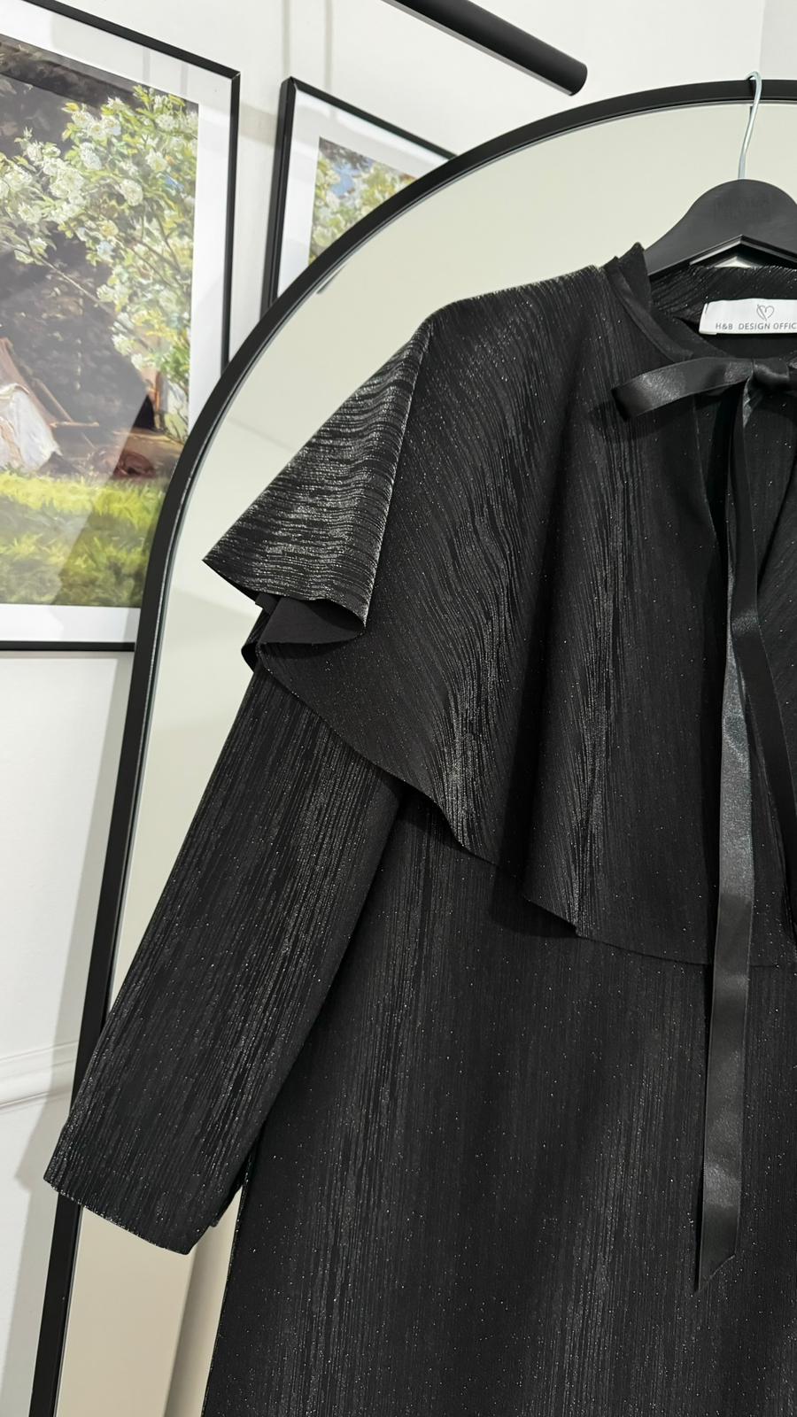 * Ürün kumaşı jakar kumaştır. Simli bir dokuya sahiptir. Ürün rengi koyu siyahtır. Çekim ışıkları ve kumaşın simlerinden ötürü açık tonda çıkmıştır. Mevsimlik, kışlık dokuya sahiptir.